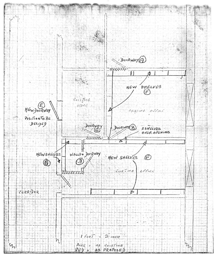 The Library space problem was solved in the most straight-forward way, expanding along the first floor of Hartland House into what had until then been staff offices. Looking at the plan below one can see the original four rooms that have today been subdivided into use for Classics and Modern Languages. A new wall was placed at the end of the corridor before the Secretary to the Principal’s office. A few interior walls were knocked through and doors sealed up to be covered with shelving, but the former layout is certainly still recognisable.