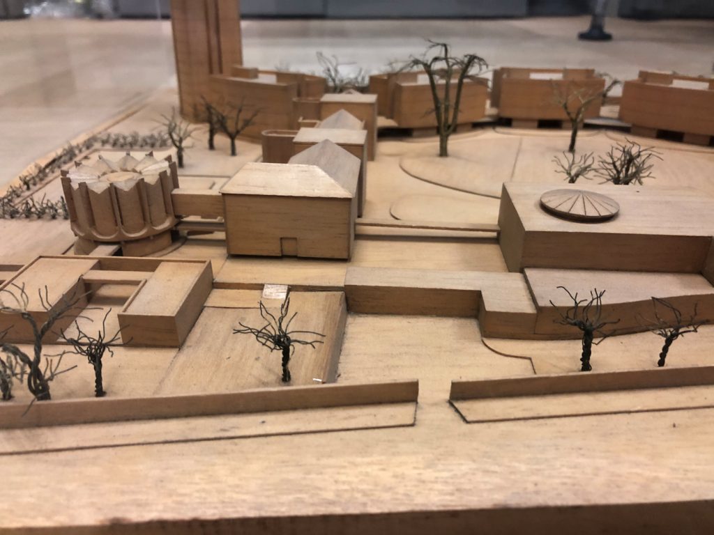 Perhaps in an effort to unify the appearance of the College, the Founders’ Gatehouse was of the same brutalist school as Wolfson and Rayne, but on a smaller scale and neatly rounded. Looking again at the model, it is easy to see a resemblance between the planned circular library and the accommodation block that ended up nearby.