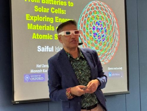 Professor Saiful Islam was delighted to give an invited outreach talk on energy materials using 3D glasses to a large number of PhD students and postdocs at Monash University Malaysia in Kuala Lumpur as part of their international Net-Zero Speaker Series; this was held on 14th November 2025 in their new Centre for Net-Zero Technology.