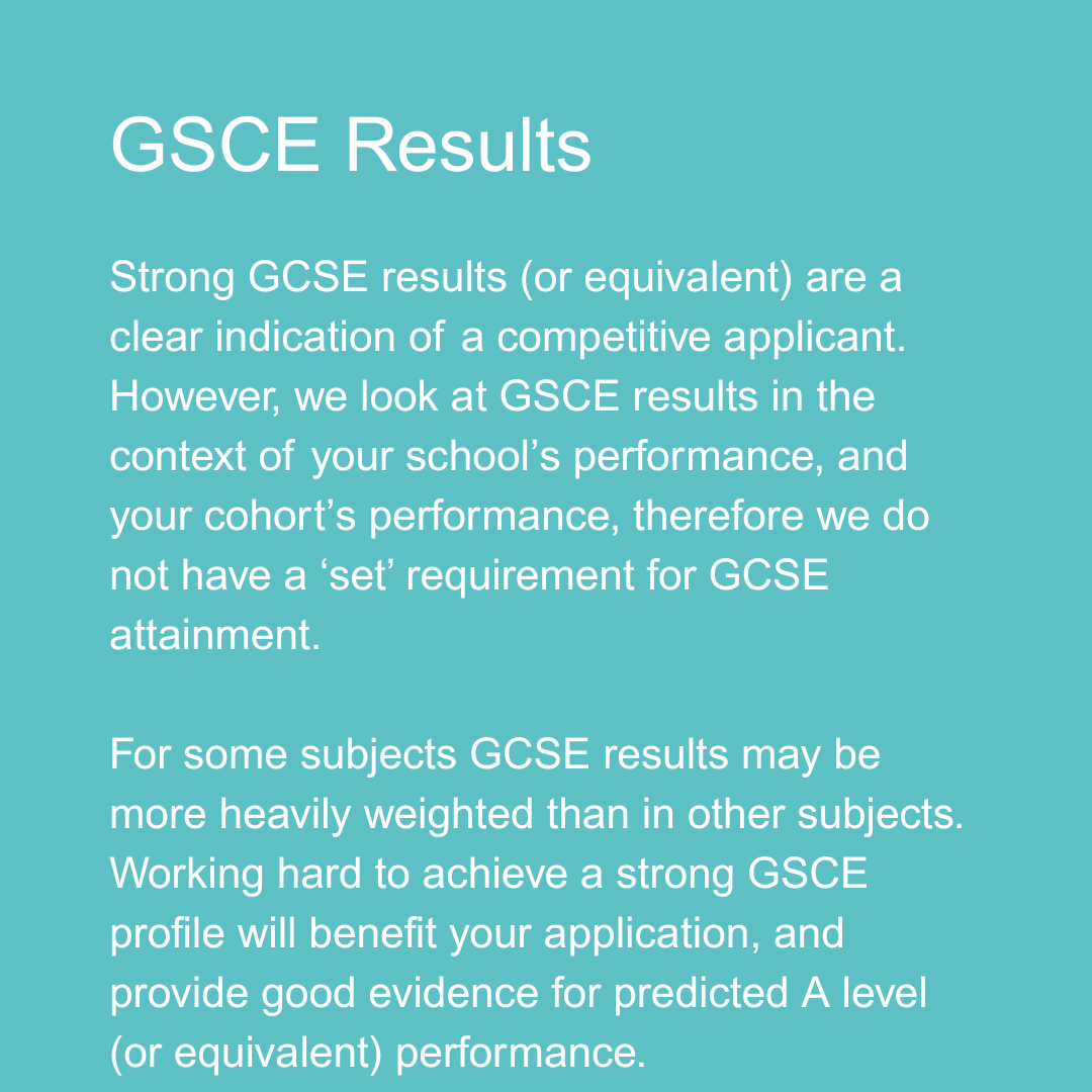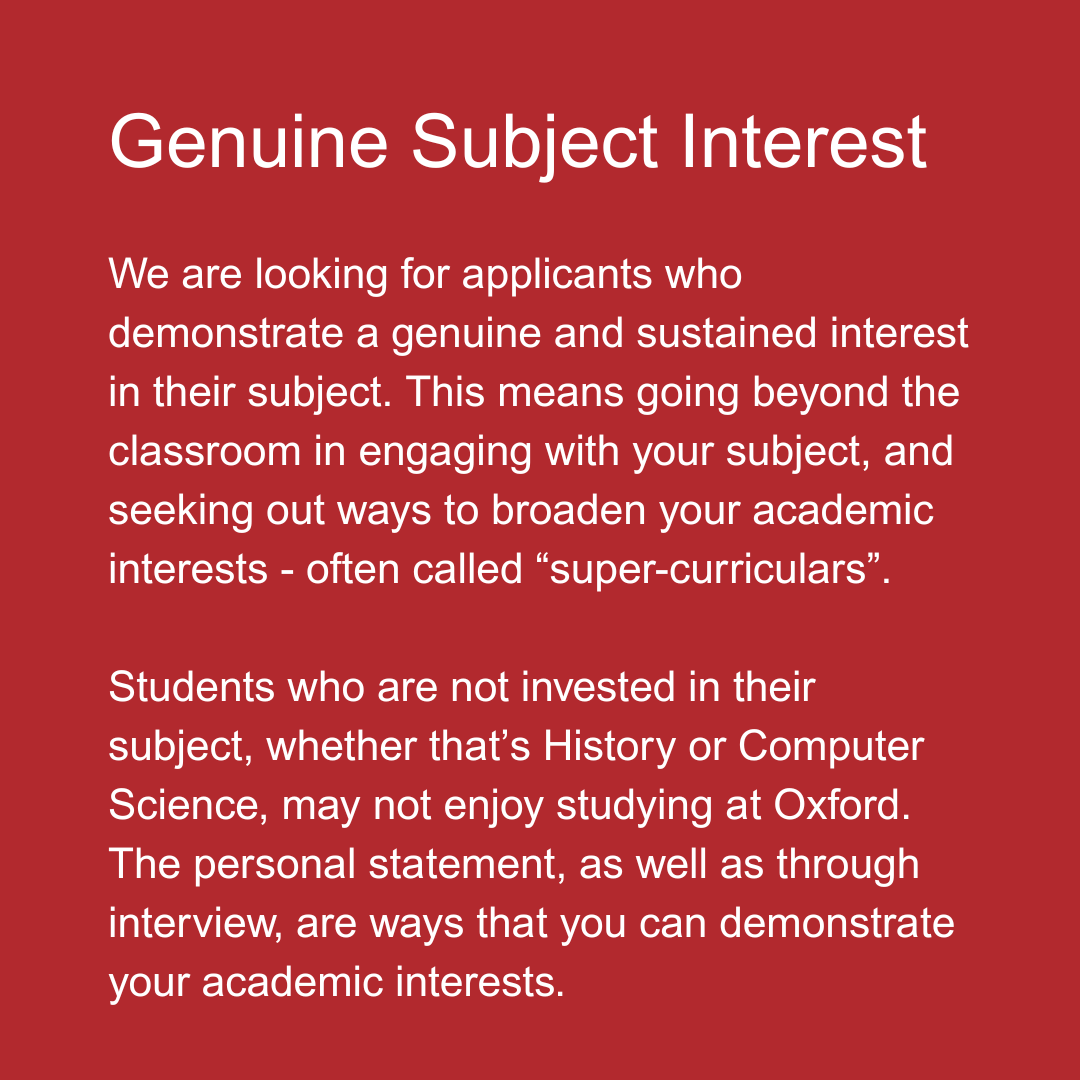 Your personal statement is your opportunity to tell admissions officers and tutors about your academic motivation for your subject, your evidence for this, and why you would like to study your course at University. The personal statement is the document that forms the basis of our impression of your academic potential and passion for your subject. This is where your super-curricular profile comes in – if you’ve been pursuing your interests outside of school, then you will have plenty to write about (and may have to be selective about what you choose!)